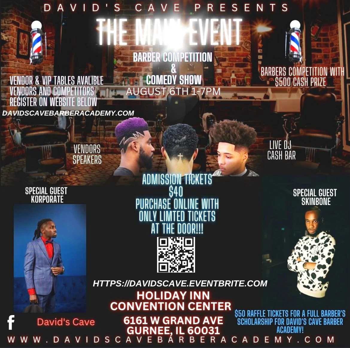 CLICK HERE TO PURCHASE TICKETS, PURCHASE TABLES, ENTER BARBER COMPETITIONS, SECURE A VENDOR TABLE DAVID’S CAVE BARBER ACADEMYPAST EVENTS CLICK HERE TO PURCHASE TICKETS, PURCHASE TABLES, ENTER BARBER COMPETITIONS, SECURE A VENDOR TABLE